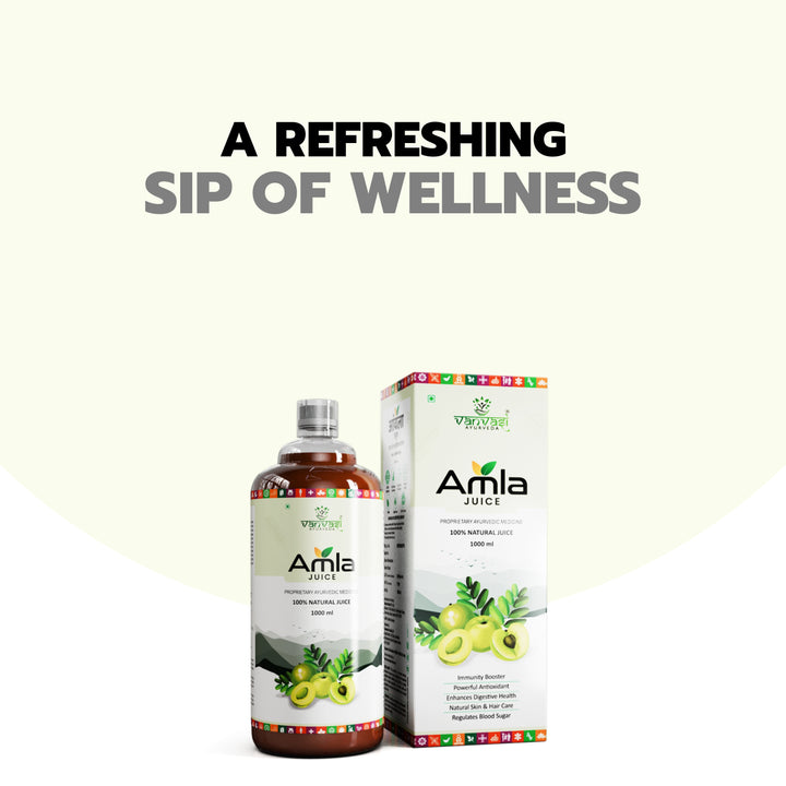 - It is time to discover the transformative power of Vanvasi Ayurveda’s Ayurvedic Amla juice, which is a potent natural elixir crafted from Indian gooseberry in order to revitalize your health from within. As the ultimate Ayurvedic Amla juice for hair, it strengthens the hair follicles and prevents premature greying, in addition to promoting lustrous locks. Besides this, its high vitamin C content makes it an exception. This Ayurvedic Amla juice for skin reduces blemishes, elevates radiance, and slows aging.