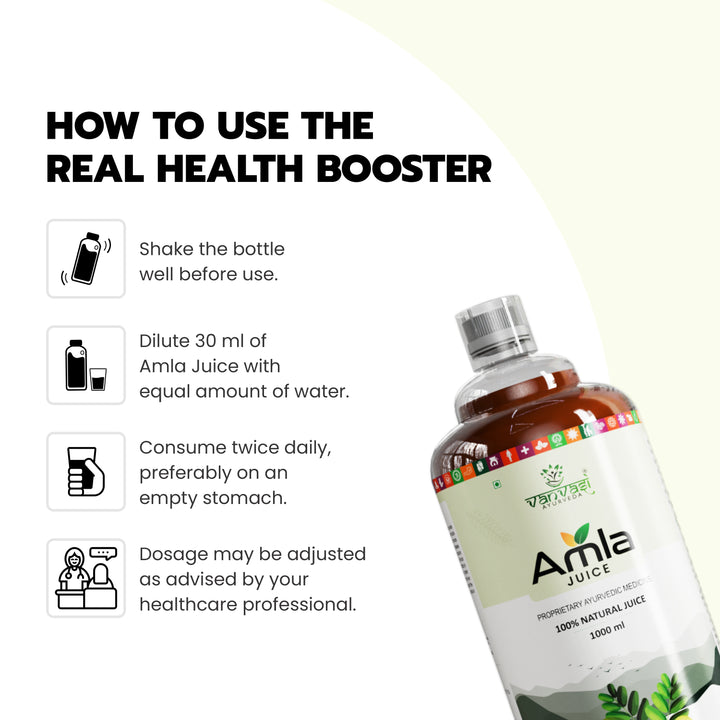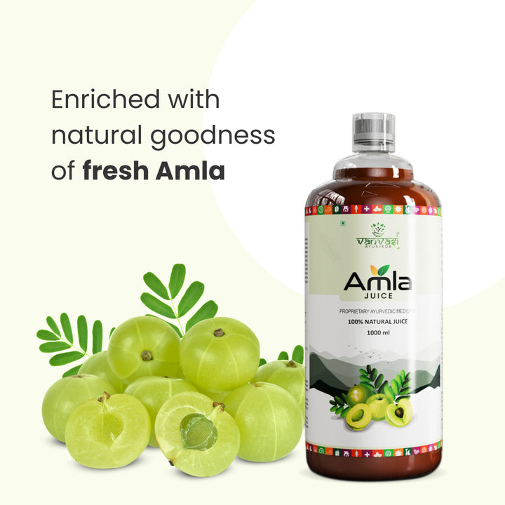- Like the synthetic supplements, Vanvasi Ayurveda’s cold-press formulation preserves Amla’s natural goodness without pushing any additives into it, hence making sure of maximum potency in every drop. Whether you consume it daily for immune defence, apply it topically for hair growth, or use it as a part of your detox regime, this versatile juice happens to have the holistic healing principles of Ayurveda embedded in it. Embrace the ancient wisdom of amla, which is a natural vitamin C powerhouse, and let Vanvasi Ayurveda’s amla juice illuminate your path to strong hair, radiant skin, a healthy liver, sharp vision, and enduring wellness.